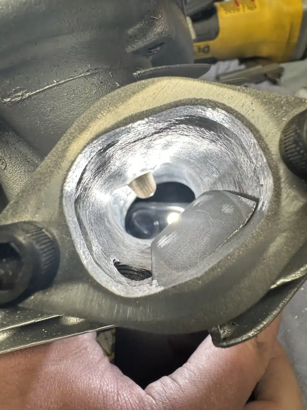 Cutting out the seats didn’t require extreme precision, just close as only the valve angle cuts required this accurate precision. After cutting out the old seats with this setup, we measured the 90-degree seat pockets for width and height, and ordered new seats from Tucker Valve Seats in Odessa, Texas. They are made from tungsten, alloyed with chrome, molybdenum and vanadium in a tool steel base, which creates an extremely strong hard alloy and are suitable with all fuels. They are far harder than the stock seats. Tucker machined them .007” oversize for a super tight press fit into the aluminum head. I made a driving tool with a center hole for a valve mandrel, to keep everything aligned as we drove them home. By heating the head to expand it at 300 degrees in the oven, and freezing the new seats with dry ice (-109 degrees F) to shrink them, we installed them with a large hammer and the tool I made. It actually turned out not to be very hard to drive the seats in with a .007” press fit. The dry ice shrunk the seats .002” and the heated head expanded the seat pockets .003”, so the actual press fit was only about .002” until the temperatures normalized. The white frozen seat can be seen in one of the photos below, beneath the driving tool, just before we drove it home.