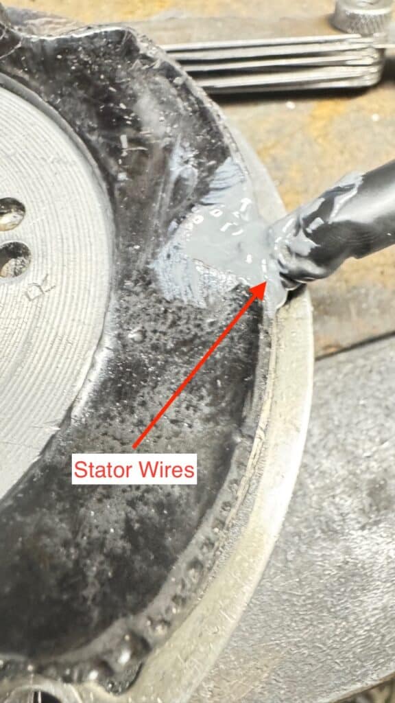 I couldn’t use the rotor drive plate to turn the altenator rotor because the spline that drove the rotor drive plate was now covered by the wider Newby drive hub. I was able to drive the rotor by a keyway cut in the rotor, but I needed to cut a new keyway into the rotor to phase it for maximum charge, timed with the ignition points just opening. With an ET ignition, it is important to get the points to break (sending the current to the coil and spark plugs) at the time of maximun charge between the rotor and the stator, hence, phasing the rotor. This new keyway also would serve to drive the alternator rotor. Additionally, with Newby’s wider drive nub, the wires exiting the backside of the alternator stator ran right into the spinning hub. As a last modification (we hope), we carefully cut away some of the epoxy covering on the stator with a razor knife to expose the wires and changed the wire exit angle by 90°. The wires now exit out the top of the stator and clear the drive hub. We filled the void this created in the stator with JB Weld epoxy to protect where we exposed the wires and hold the wires in place. I can’t imagine the effort and expense someone would have to go through to install a Newby clutch without our equipment or machining skills. Although there is a lot to like about the build quality of this clutch, proper fit and installation are difficult at best.