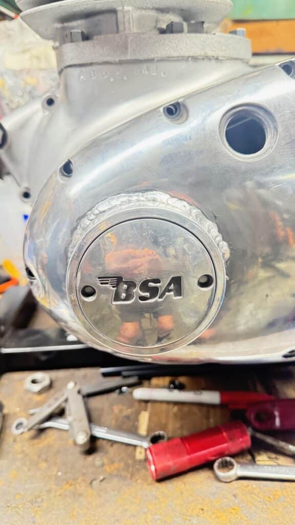 This fix involved buying longer 5/16” studs from McMaster-Carr. Installing them was more complicated because this motor uses Witworth (British Standard) threads on all the nuts and bolts. I change to SAE (Imperial threads) as needed and on almost all new parts, if I can. The British stopped using Witworth threads around 1968 on motorcycles, switched to SAE for a few years and then went to Metric. Some of their later bikes had all three thread standards, meaning three different tool sets were required to work on them. My bike falls into this category. Our problem was that we had to install SAE 5/16’x18 studs into a 5/16”x26 Witworth tapped hole. SAE (and Metric) threading uses a 60° thread pitch while the Witworth system uses a 55° pitch. Our choice was to either drill out and re-tap the holes and using Helicoil inserts, or drill out and re-tap the holes using a threaded insert called Time-Serts. Both had their own issues. Helicoils have a steel tab for installation that you break off when the coil is installed. Chances were great that breaking off these steel tabs could fall into the motor causing big issues so Heilcoils were out for an assembled motor. Since the alternator stud holes are through holes into the motor crankcase, re-taping them would require special care. Even though the taping chips are aluminum, we didn’t want them going into the crankcase, if possible. Using a thick grease coated all over the drill and tap, we drilled and then re-taped the holes to 3/8” with a special Time-Sert tap, removing the tap every couple of turns and cleaning the metal embedded in the grease from the tap. We repeated this process until we got to the depth we needed and then used several Q-Tips with acetone on each hole for cleanup. Had this been a 1968 BSA or later, the new longer SAE studs would have fit perfectly.
