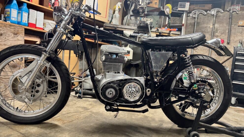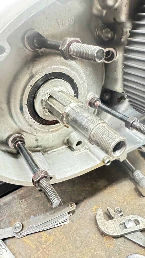 The last three things we did to the motor on the workbench were to adjust the valve clearance, find top dead center with a degree wheel, adjust the points gap and time the ignition points. With the points just opening, we phased the alternator rotor with the stator for maximum charge and marked the rotor so that it lined up with the crankshaft keyway. We cut a new key slot in the rotor to complete this task and tightened the rotor nut, machined from 4340 steel, the same metal as the crankshaft. The crankshaft nut now doubles as a crankshaft extension for extra support, entering the outrigger bearing machined into the primary case.